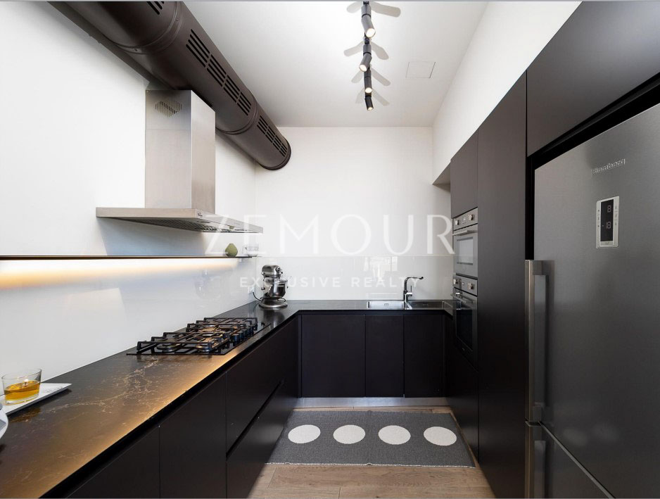 ON THE FIRST FLOOR KITCHEN AND LIVING ROOM WITH BALCONY GLASS DOOR, HIGH CEILING WITH OUTER GLASS WALL.