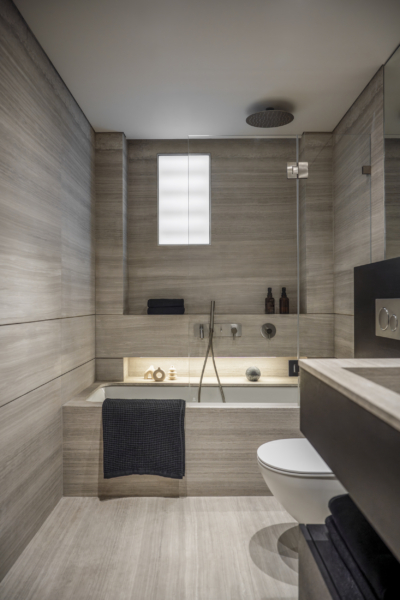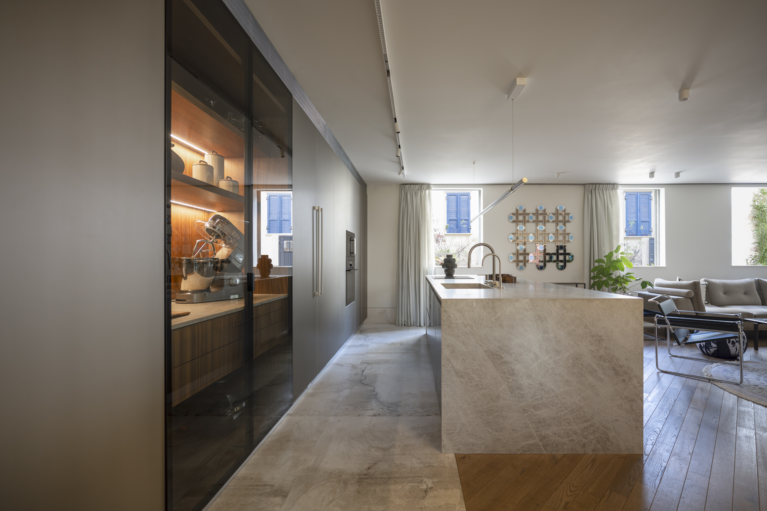 THE HEART OF THE HOME, THE HIGH-END KITCHEN WITH AN ISLAND, IS COMPLEMENTED BY CUSTOM CARPENTRY THAT GRACES EVERY CORNER OF THE APARTMENT.